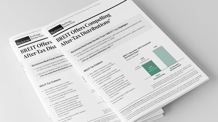 - If all BREIT distributions were taxable as ordinary income, investors would need to find an investment that generates a pre-tax distribution rate of 7.5% to match the 4.7% after-tax distribution rate generated by BREIT Class I shares [ 3 ][ 6 ]